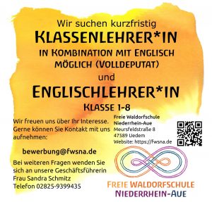 Wir suchen Fachlehrer*innen und engagierte, einfühlsame Klassenlehrer*innen (1.-8. Klasse) mit Waldorfausbildung oder mit Interesse zur berufsbegleitenden Weiterbildung.