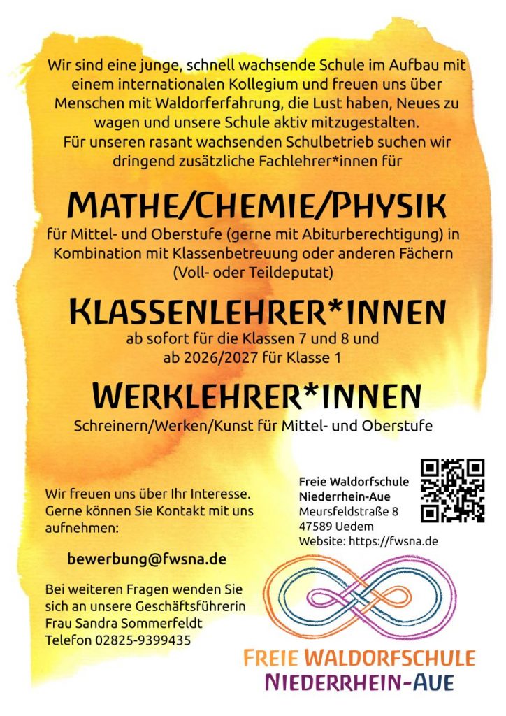 Wir suchen Fachlehrer*innen und engagierte, einfühlsame Klassenlehrer*innen (1.-8. Klasse) mit Waldorfausbildung oder mit Interesse zur berufsbegleitenden Weiterbildung.